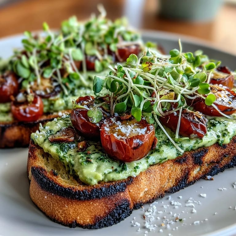Save This vibrant, nourishing open-faced toast features creamy avocado pesto, juicy cherry tomatoes, and crisp microgreens atop rustic sourdough. Perfectly suited for breakfast or brunch, this contemporary vegetarian dish is both easy to prepare and incredibly satisfying, taking only 20 minutes from start to finish.
