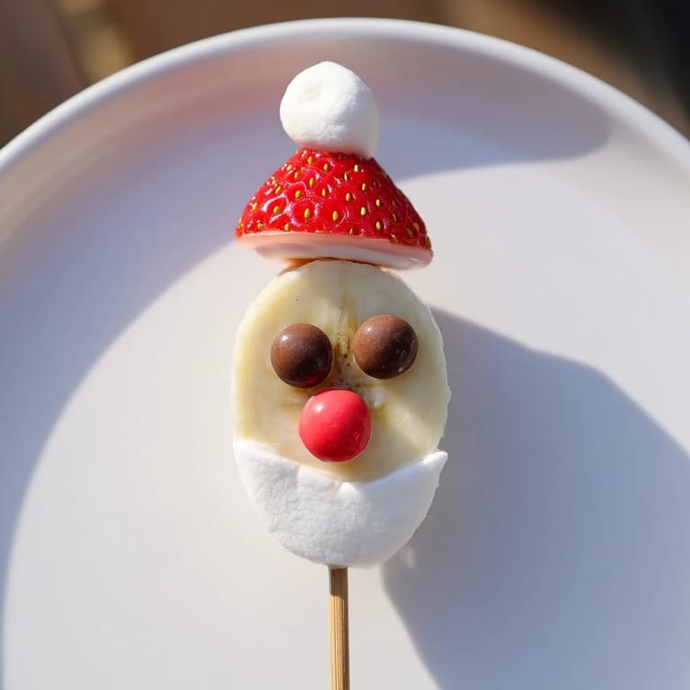 Save Festive and fun fruit skewers featuring bananas, strawberries, and marshmallows, perfect for holiday gatherings or a healthy kid-friendly treat.