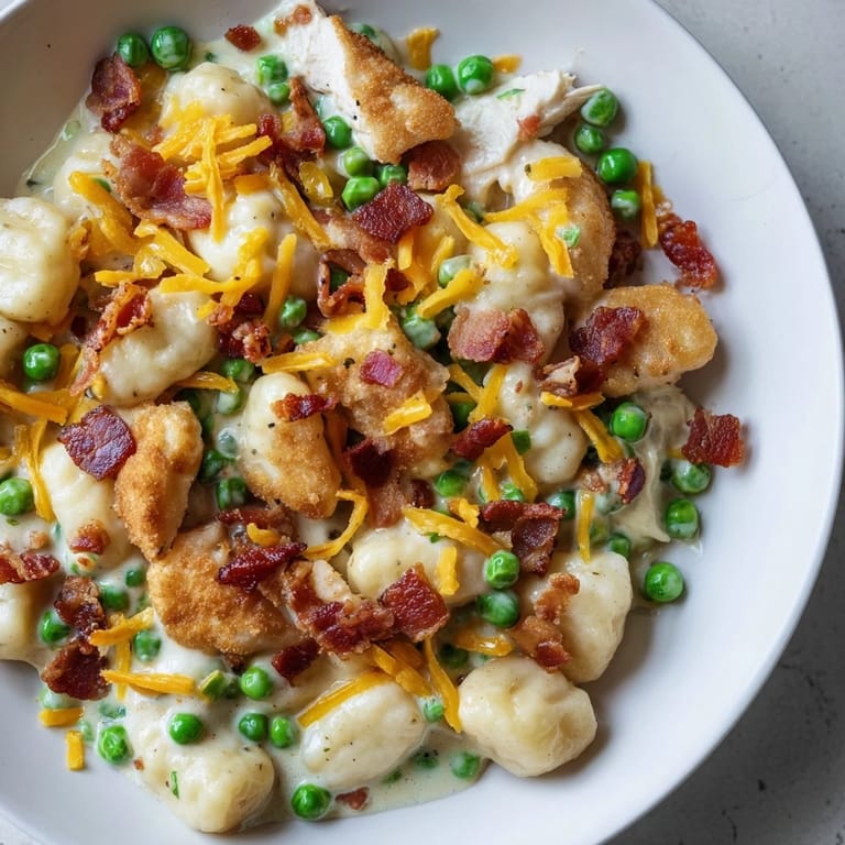 Save Experience the ultimate comfort food: pillowy potato gnocchi coated in a rich, creamy chicken sauce loaded with savory herbs, crispy bacon, and cheddar cheese for irresistible flavor.
