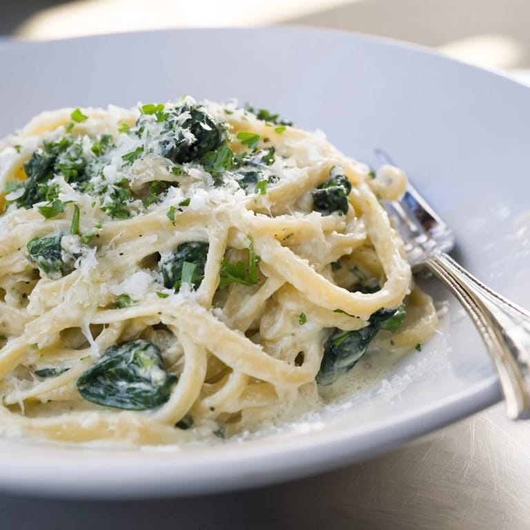 Save A luscious, lighter twist on classic Alfredo, featuring tender pasta tossed in a creamy Greek yogurt sauce with fresh spinach and Parmesan.