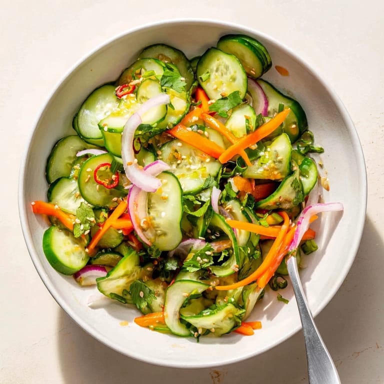 Save A refreshing, vibrant cucumber salad tossed with Asian-inspired seasonings, sesame oil, and fish sauce for a savory, tangy kick—perfect as a side or light appetizer.