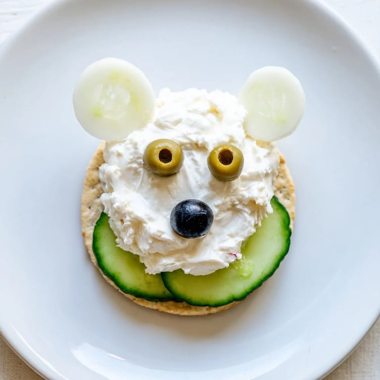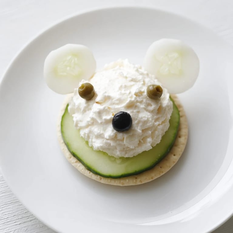 - Using a small spoon or piping bag, drop a rounded mound of cream cheese mixture onto the cucumber slice as the polar bears head.