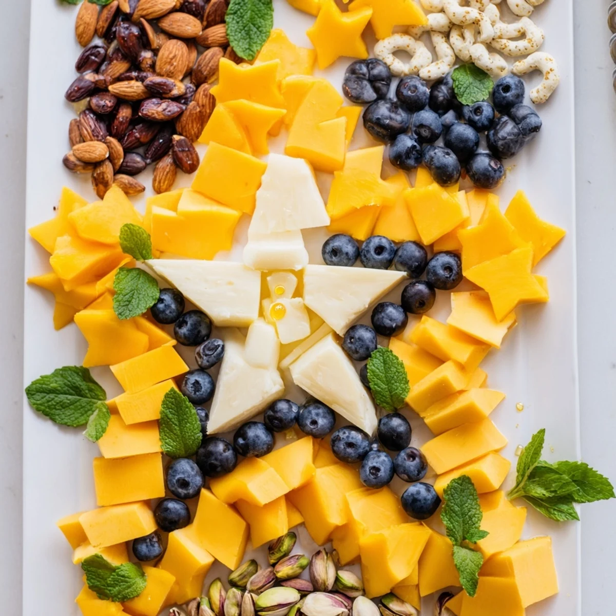 This vibrant snack board is artfully arranged into a shooting star shape, combining creamy cheddar, gouda, and brie cheeses with star-shaped crackers, fresh fruits like mango and blueberries, and sweet accents such as yogurt-covered pretzels and dark chocolate stars. Nuts and honey add texture and richness, making it perfect for easy entertaining or family get-togethers. Simple to assemble in about 25 minutes, it invites creative flavor combinations and festive presentation.