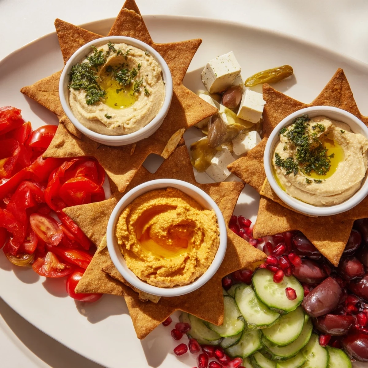 Save A vibrant mezze platter inspired by the Three Kings tradition, featuring star-shaped pita, colorful dips, and Mediterranean delights—perfect for sharing at festive gatherings.