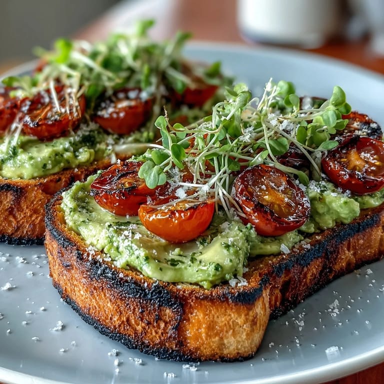 Save This vibrant, nourishing open-faced toast features creamy avocado pesto, juicy cherry tomatoes, and crisp microgreens atop rustic sourdough. Perfectly suited for breakfast or brunch, this contemporary vegetarian dish is both easy to prepare and incredibly satisfying, taking only 20 minutes from start to finish.