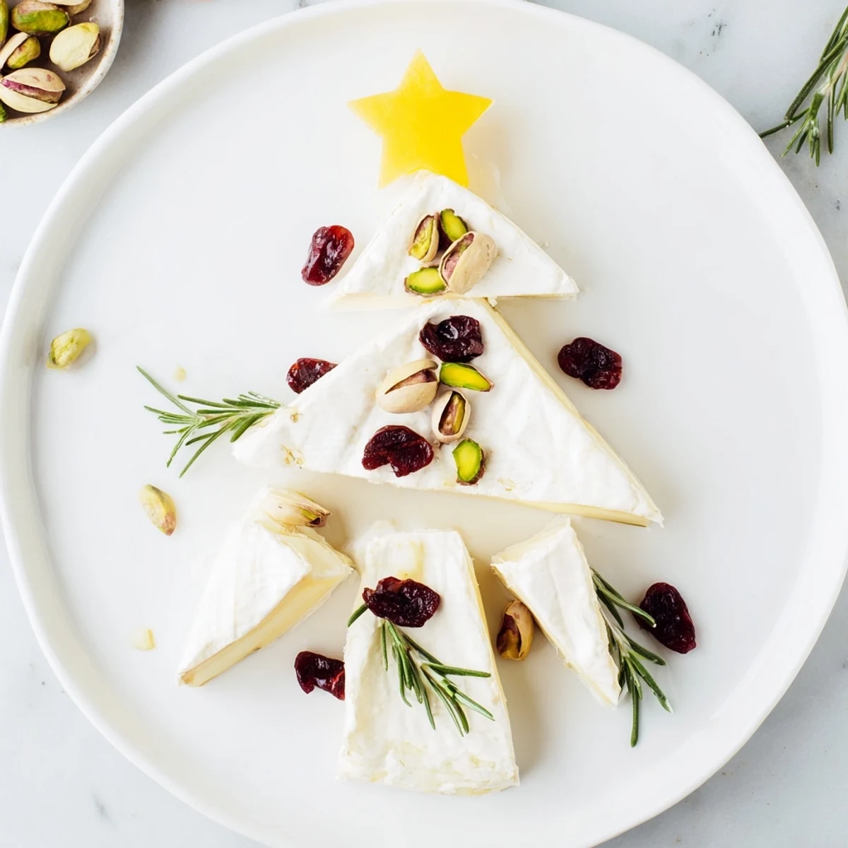 A festive and elegant cheese display featuring creamy Brie wedges arranged in a tree shape, perfect for holiday gatherings or entertaining.