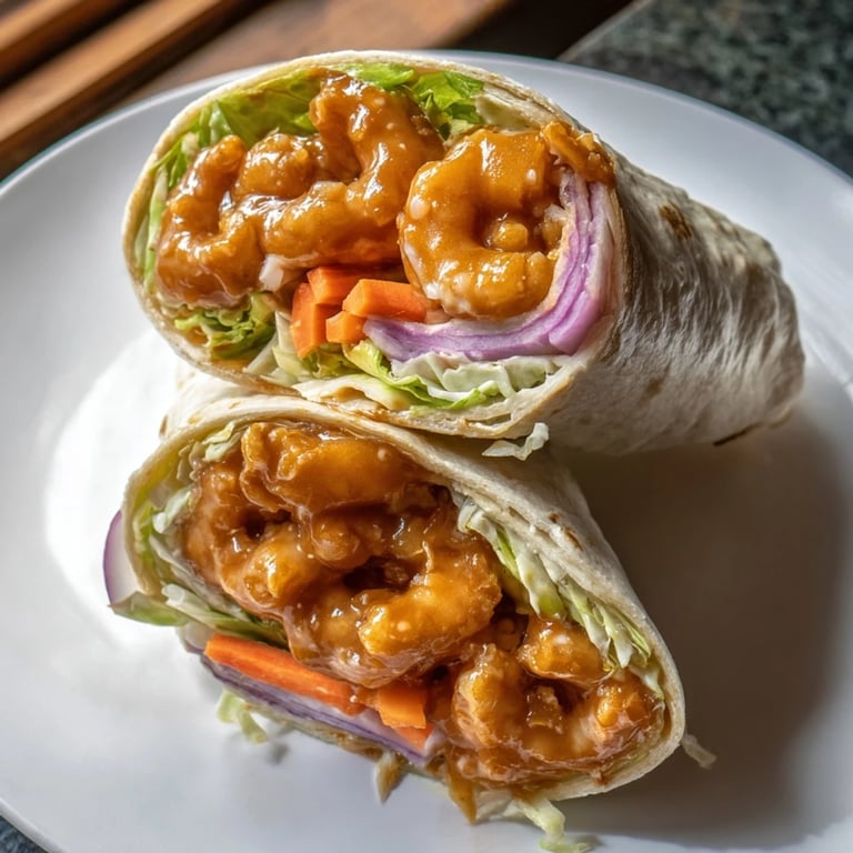 Save Plump shrimp tossed in spicy buffalo sauce, wrapped with crisp lettuce, creamy ranch, and tangy vegetables for a zesty, satisfying meal.