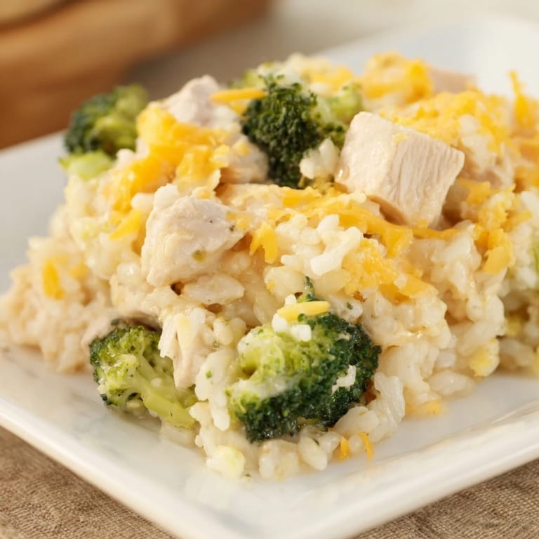 This creamy chicken and broccoli dish brings together tender chicken breast, fresh broccoli florets, and fluffy long-grain rice baked in a smooth, homemade sauce. Onions and garlic are sautéed to add depth before mixing all components with cheddar cheese and seasoning. Baked until bubbling and golden on top, this comforting meal offers warmth perfect for family dinners and easy weeknight cooking. Optional breadcrumb topping adds a crispy finish, while substitutions like brown rice or extra veggies allow customization.