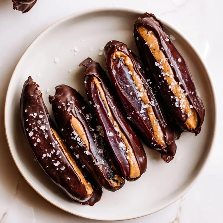 Save I discovered these dates quite by accident at a farmers market one afternoon when I was hunting for something sweet but not too heavy. The vendor handed me a Medjool date to taste, and something about that caramel-like sweetness made me think: what if I could make this feel like a chocolate bar? That evening, I stuffed one with peanut butter, dipped it in melted dark chocolate, and the whole kitchen smelled like a candy shop. My partner walked in mid-creation and asked for one before they were even set in the fridge. Now they're the snack I make when I want something that feels indulgent but doesn't leave me feeling weighed down.
