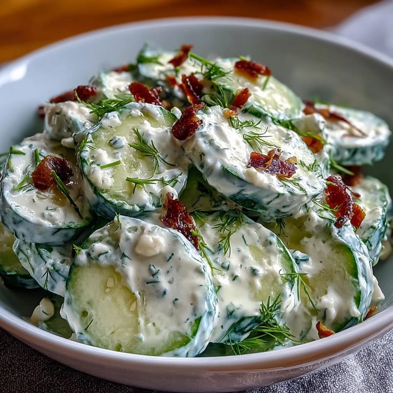 Save My neighbor brought this over one scorching July afternoon, and I remember thinking it was just cucumber and yogurt until I tasted it—the dill hit differently, brighter somehow, and suddenly I understood why she'd been raving about it. There's something about the way the creamy dressing clings to those thin slices that makes you forget you're eating something so simple. I've made it dozens of times since, usually when I'm too hot to actually cook but still want something that feels intentional on the plate.