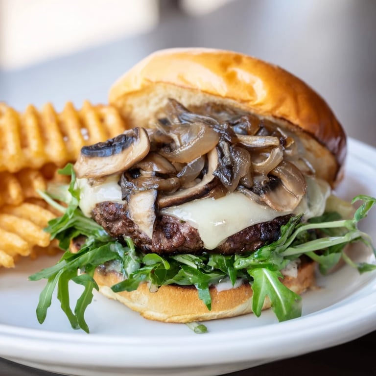 This dish features a juicy beef patty seasoned and cooked to perfection, topped with sautéed mushrooms and melted Swiss cheese. The savory combination is complemented by crisp, golden waffle fries baked until crunchy. Optional toppings like mayonnaise, Dijon mustard, and fresh arugula add bright flavors and texture. Cooking involves searing the patties and mushrooms separately, then assembling with toasted buns. Ideal for a straightforward, flavorful American main dish.