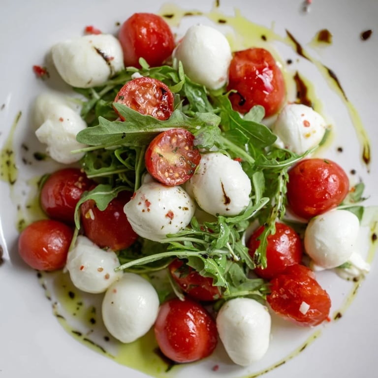 Save There's something about a perfectly composed salad that stops conversation mid-sentence. I discovered this with The Pearly Strand one summer afternoon when I was tasked with bringing something to a potluck and had exactly thirty minutes and a wilting grocery bag to work with. What started as panic became this delightfully simple arrangement of cherry tomatoes, peppery arugula, and those impossibly creamy mozzarella pearls draped across like edible jewelry. It's the kind of dish that looks like you spent hours in the kitchen but actually asks for nothing but good ingredients and a light hand.