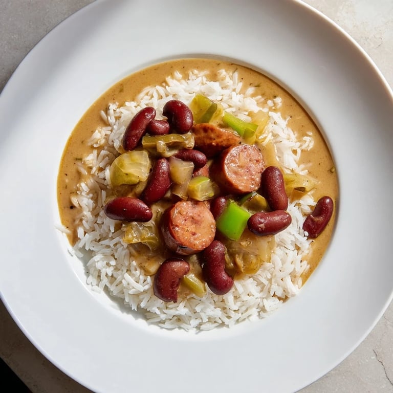 A classic Creole dish featuring tender red beans simmered with smoky sausage and aromatic vegetables, served over fluffy white rice. Hearty, flavorful, and perfect for a comforting meal.