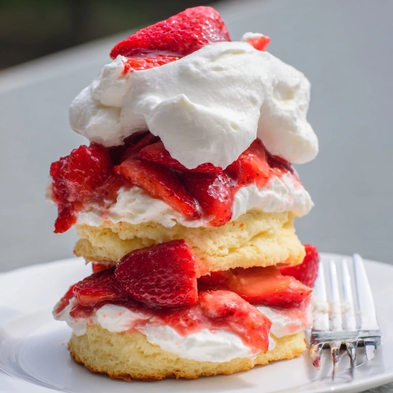 If you do not have access to fresh strawberries try a blend of raspberries blueberries or blackberries for variation. For a dairy-free version substitute coconut cream and a vegan butter option for the biscuits and whipped topping. Gluten-free all-purpose flour can be swapped for regular flour but watch the dough texture and avoid over-mixing.